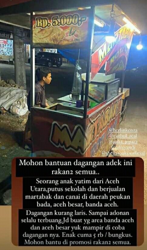 Dalam foto itu, Azmi duduk di balik gerobak martabak. Foto tersebut berisi keterangan, “Mohon bantuan dagangan adek ini rakan2 semua.. Seorang anak yatim dari Aceh Utara, putus sekolah dan berjualan martabak dan canai di daerah peukan bada, aceh besar, banda aceh. Dagangan kurang laris. Sampai adonan selalu terbuang. Jd buat yg area banda aceh dan aceh besar yuk mampir di coba dagangan nya. Enak cuma 5 rb/bungkus. Mohon dibantu di promosi rakan2 semua”.