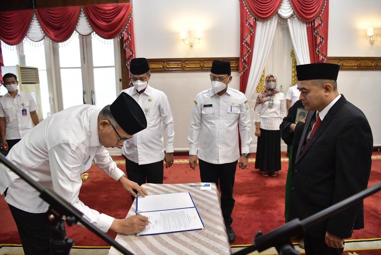 BANDA ACEH – Gubernur Aceh, Nova Iriansyah, melantik Jamaluddin menjadi Inspektur Aceh menggantikan Zulkifli yang akan segera memasuki masa purna tugas. Pengambilan sumpah dan pelantikan pimpinan tinggi pratama itu berlangsung di ruang tengah Meuligoe Gubernur Aceh, Rabu, 15 Juni 2022.