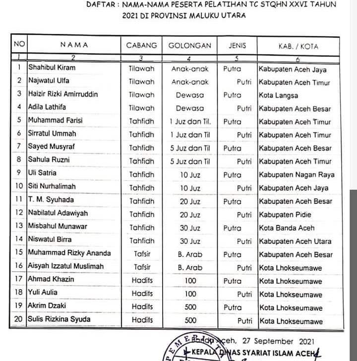 Adapun jumlah kontingen Aceh yang berangkat ke Maluku Utara sebanyak 44 orang terdiri dari 20 peserta—lima di antaranya santri Dayah Mataqu Lhokseumawe, delapan pelatih, dan 16 ofisial yang bertugas sebagai pendamping, pengasuh, dan tim medis selama kegiatan berlangsung.