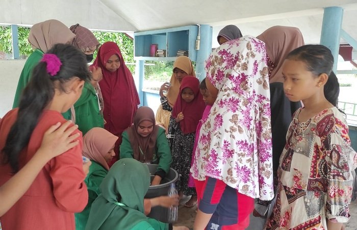LHOKSUKON – Mahasiswa Universitas Malikussaleh (Unimal) yang melakukan Kuliah Kerja Nyata (KKN) di Gampong Meuriya, Kecamatan Kuta Makmur, Kabupaten Aceh Utara mengajari warga setempat membuat sabun.