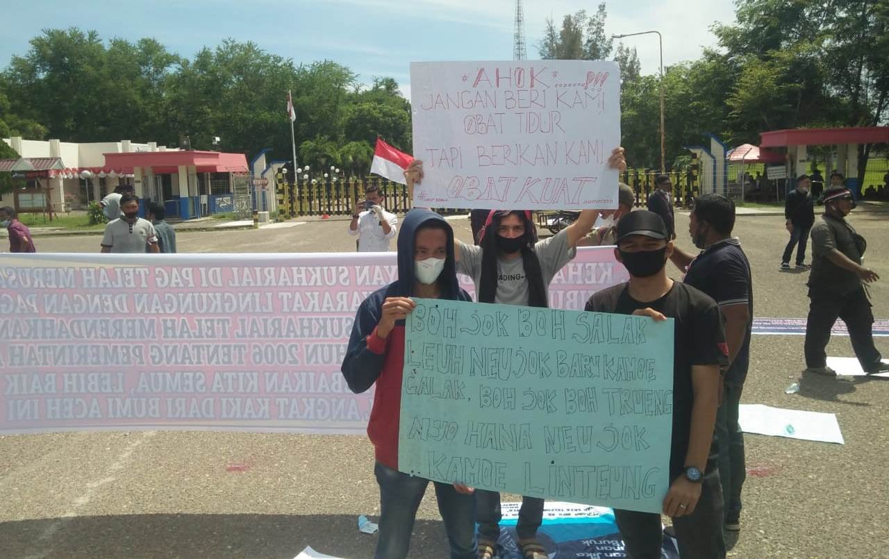 Massa berunjuk rasa sejak pukul 09.00 WIB. Pendemo membentangkan sejumlah spanduk, di antaranya bertuliskan “Di bawah Pimpinan Direktur Operasional dan HRD PT PAG yang Sekarang, Merobek Kearifan Lokal yang Telah Dibina. Selama Ini Kebijakan Anda Merendahkan UUPA Nomor 11 Tahun 2006 Tentang Keistimewa Aceh. Kami Mau Anda Tidak Lagi Di Sini“.