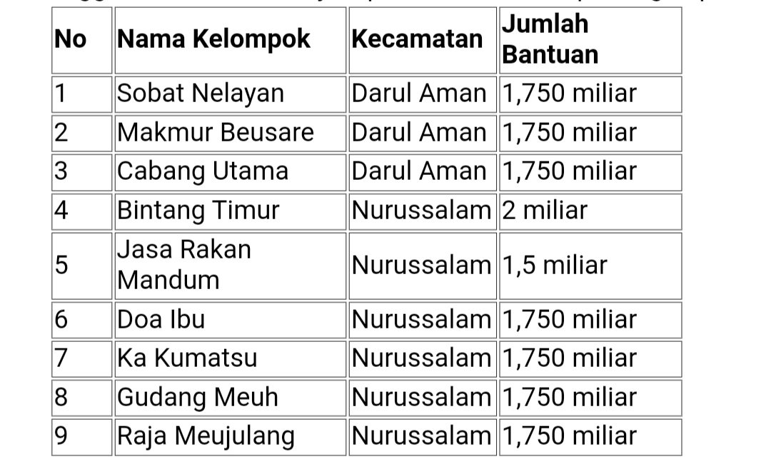 [Daftar Nama Kelompok Penerima Bantuan di Kabupaten Aceh Timur. Sumber: MaTA]