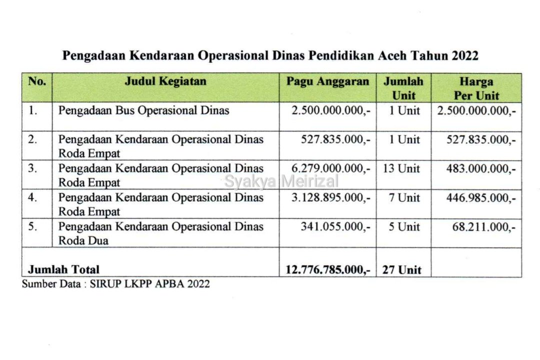 BANDA ACEH – Masyarakat Transparansi Aceh (MaTA) menilai kebijakan pengadaan kendaraan operasional pada Dinas Pendidikan (Disdik) Aceh tahun anggaran 2022 sebanyak 27 unit senilai Rp12,776 miliar merupakan bentuk pemborosan keuangan Aceh.