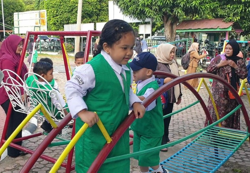 Wali murid kemudian menemani anaknya bermain ayunan, seluncuran, jungkat jungkit, dan aneka alat permainan edukatif (APE) lainnya. Mereka riang gembira di tengah suasana hiruk pikuk kota.