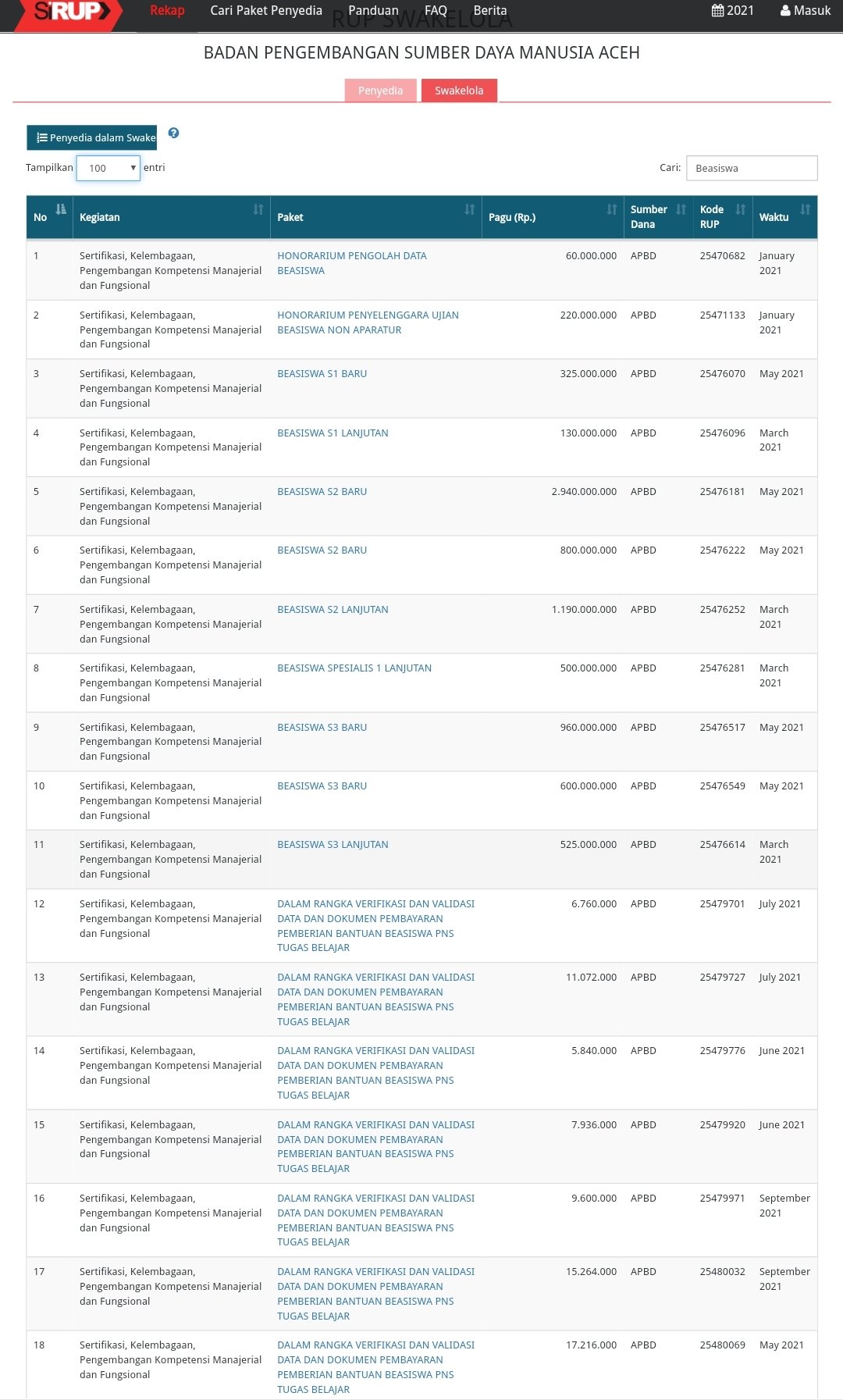 (Tangkapan layar laman resmi SIRUP LKPP terkait data dana beasiswa di BPSDM Aceh tahun anggaran 2021. Foto: portalsatu.com/)