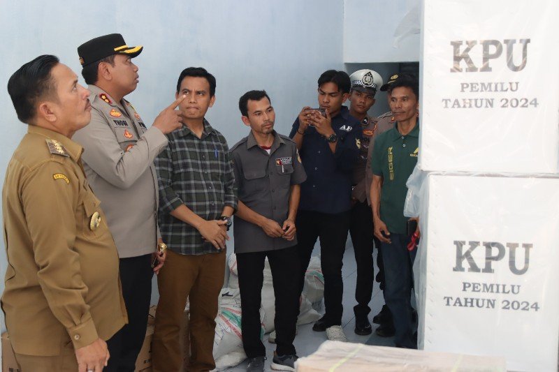 SUBULUSSALAM – Wali Kota Subulussalam, H. Affan Alfian Bintang, S.E bersama Kapolres AKBP Yhogi Hadisetiawan, S.I.K meninjau Gudang Logistik Komisi Independen Pemilihan (KIP) Kota Subulussalam di Jalan Raja Tua, Selasa, 9 Januari 2024.