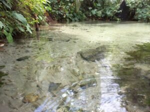 Debit air terus mengalir ke kolam dengan kedalaman sekitar satu meter itu setiap saat tanpa henti-hentinya. Agar kolam tidak beluber, beberapa sudut disiapkan lobang pembuangan air, setiap satu jam sekali air berganti secara alami, sehingga kolam selalu tampak jernih, bersih dan kehijauan karena dikeliling pohon-pohon besar dan ditutupi dengan dedaunan.
