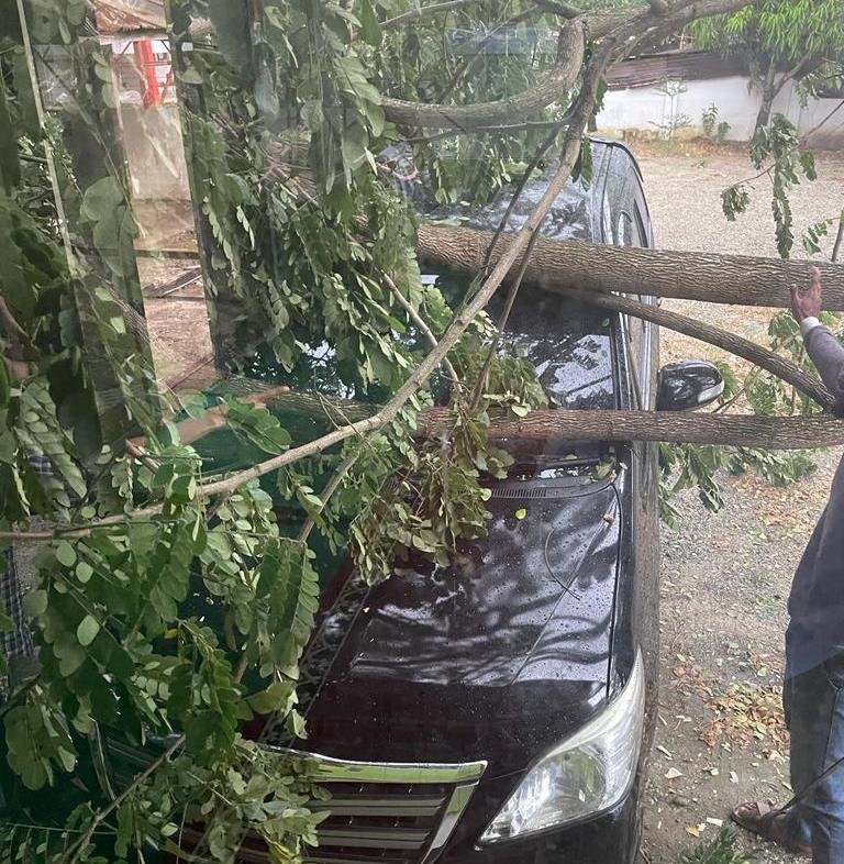 [Mobil dinas Kepala Dinas PK Aceh Utara tertimpa pohon tumbang. Foto: Ist]