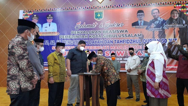 BeasiswaSUBULUSSALAM – Pemerintah Kota Subulussalam menyalurkan bantuan beasiswa sebesar Rp 1.200.000.000 kepada 751 mahasiswa berlangsung di aula Meuligoe Wali Kota Subulussalam, Sabtu, 27 November 2021.