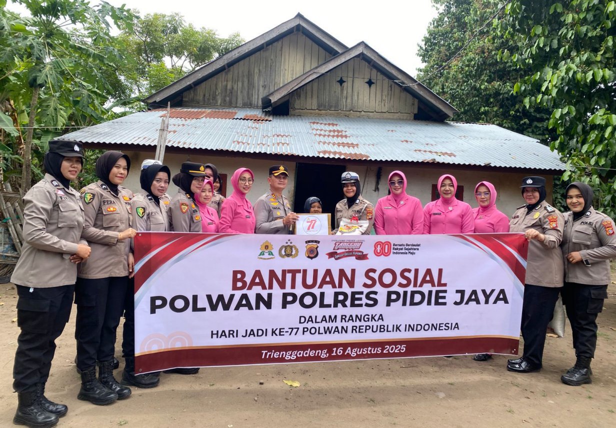 PIDIE JAYA – Polwan Polres Pidie Jaya melaksanakan kegiatan bantuan sosial (baksos) kepada masyarakat kurang mampu dalam rangka memperingati Hari Jadi Polisi Wanita (Polwan) ke-77 Republik Indonesia, Sabtu, 16 Agustus 2025.