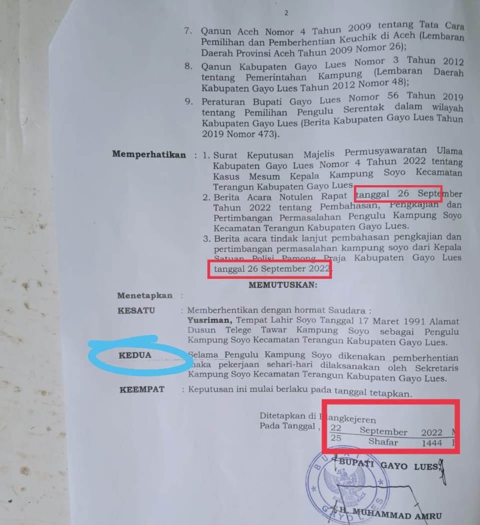 BLANGKEJEREN – Pemerintah Kabupaten Gayo Lues harus berhati-hati dalam membuat dan mengeluarkan surat pemberhentian Pengulu (Kepala Desa) yang belum habis masa jabatanya, baik akibat ulah Pengulu itu sendiri ataupun karena hal lainnya.
