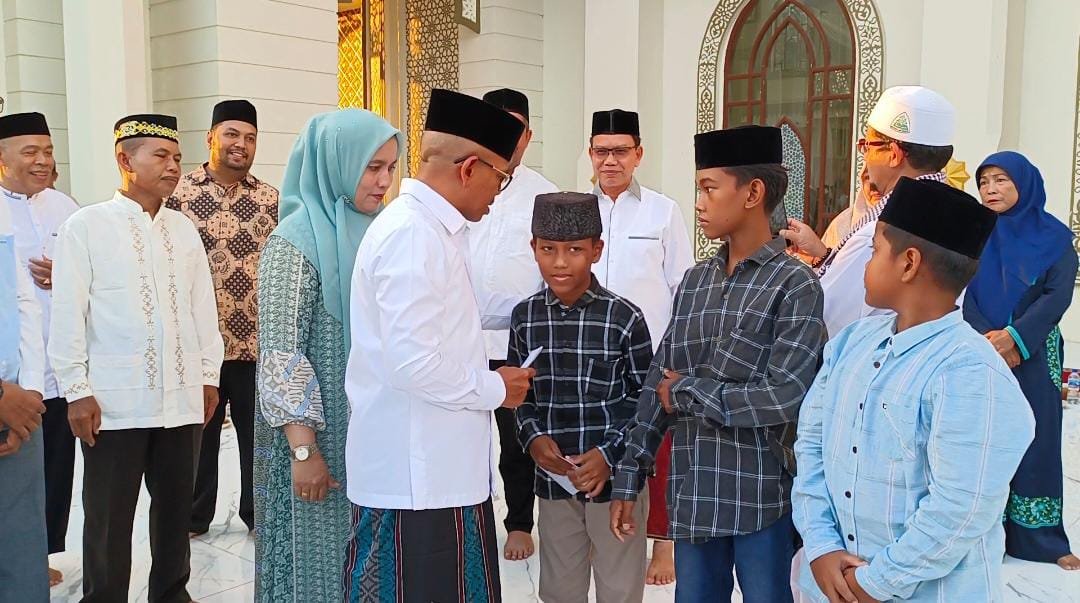 ACEH JAYA – Penjabat Bupati Aceh Jaya, Dr. A. Murtala., M.Si., didampingi Ketua TP PKK Aceh Jaya, Mahdalena, S.E., M.S M., menyerahkan santunan kepada puluhan anak yatim dalam rangka memperingati Nuzulul Qur’an di Masjid Agung Baitul Izzah, Calang, Kamis, 28 Maret 2024.
