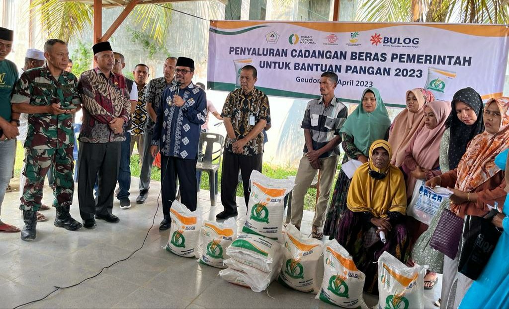 ACEH UTARA – Penjabat Bupati Aceh Utara, Azwardi, AP., M.Si., bersama pejabat terkait mulai menyalurkan Bantuan Pangan Cadangan Beras Pemerintah (BP-CBP). Penyaluran secara simbolis dilakukan di halaman Kantor Pos Geudong Kecamatan Samudera, Kamis, 13 April 2023.