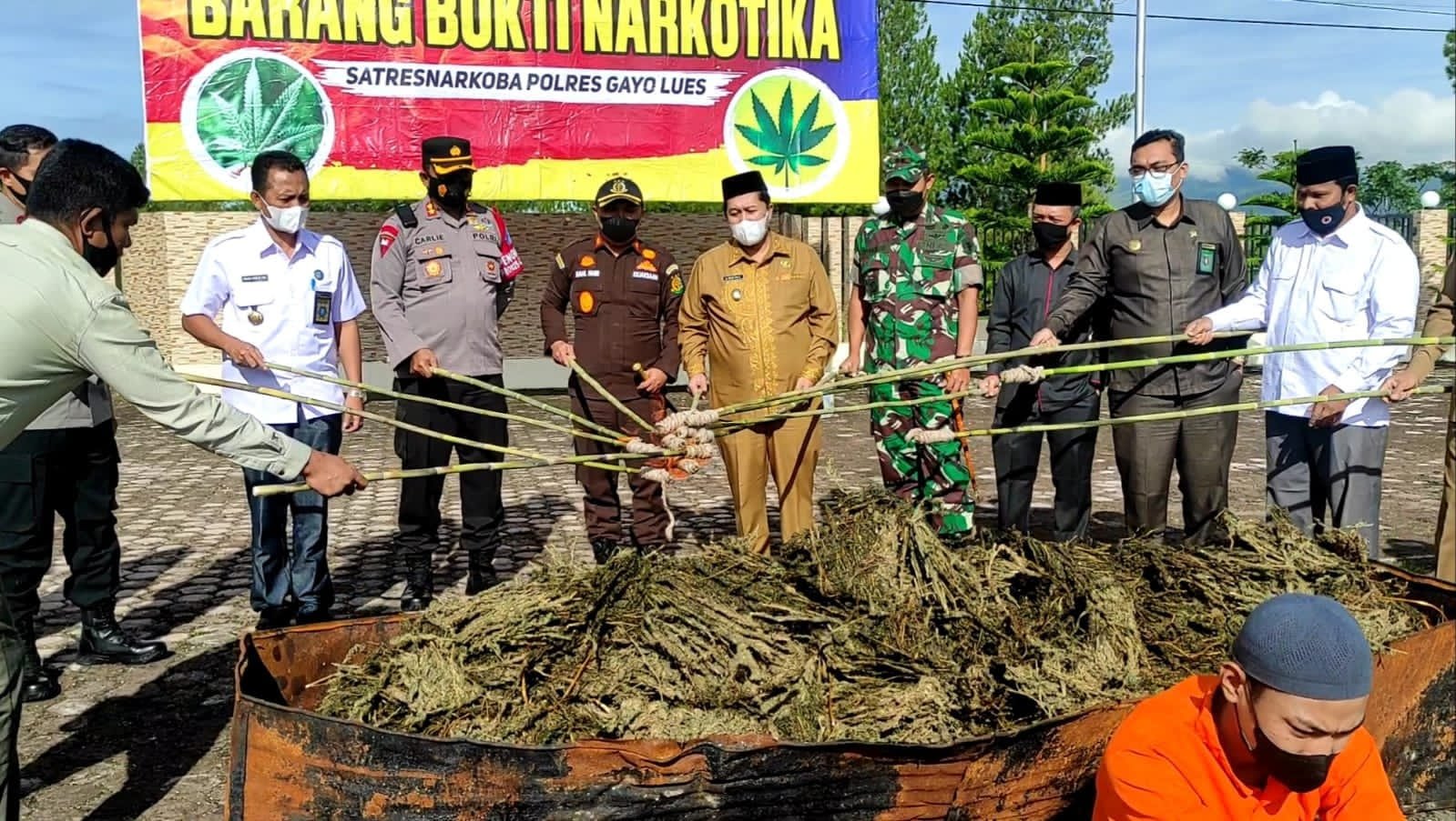 BLANGKEJEREN – Sebanyak 59,755 Kg ganja kering dimusnaskan di halaman Polres Gayo Lues, Selasa, 25 Januari 2022. Ganja yang dikemas dalam 12 bal itu ditangkap dari IA (22) pelajar asal Kabupaten Aceh Tamiang pada 7 Desember 2021 di desa Cane Toa, Kecamatan Rikit Gain, Kabupaten Gayo Lues.