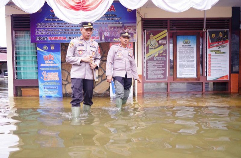 SIGLI- Hingga hari ketiga banjir melanda hampir seluruh wilayah Kabupaten Pidie, sejak Sabtu, 21 Januari 2023, Kantor Polsek Pidie dan Grong-Grong masih terendam. Kapolres Pidie bersama rombongan, Senin, 23 Januari 2023, sambangi ke dua lokasi tetsebut.