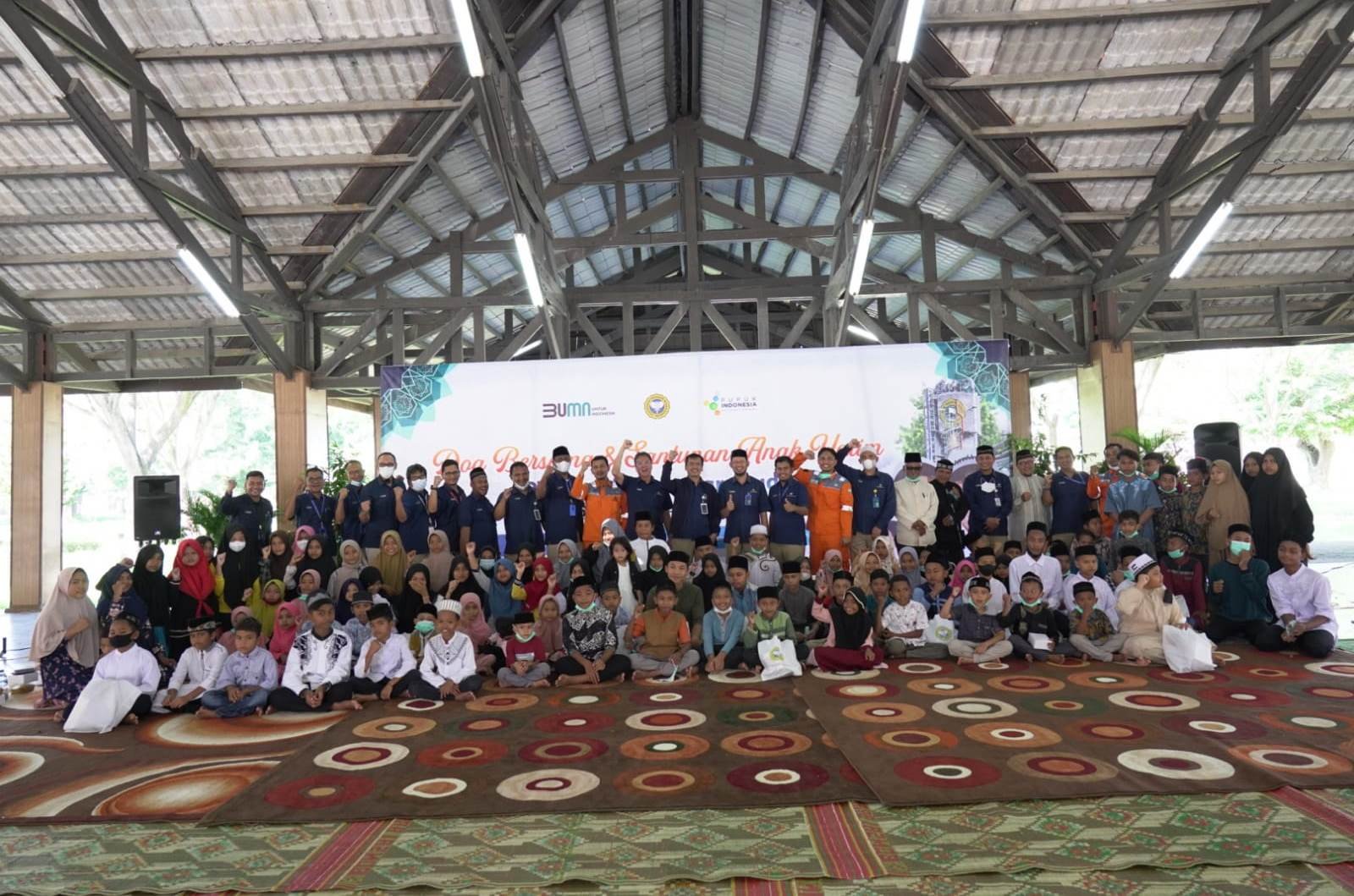 KRUENG GEUKUEH – PT Pupuk Iskandar Muda (PIM) melaksanakan syukaran akhir tahun dengan menyantuni anak yatim dan doa keselamatan bersama ulama, di Pendapa PT PIM, Krueng Geukueh, Kecamatan Dewantara, Aceh Utara, Senin, 27 Desember 2021.