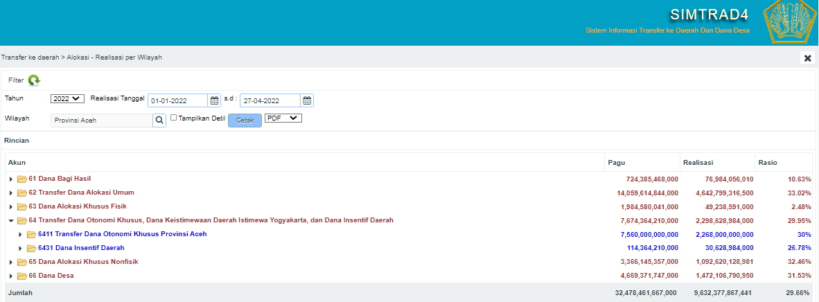 Data realisasi transfer Dana Otsus Aceh tersebut dilihat portalsatu.com/, Rabu, 27 April 2022, pada aplikasi Sistem Informasi Transfer ke Daerah dan Dana Desa (Simtrada) Kementerian Keuangan.