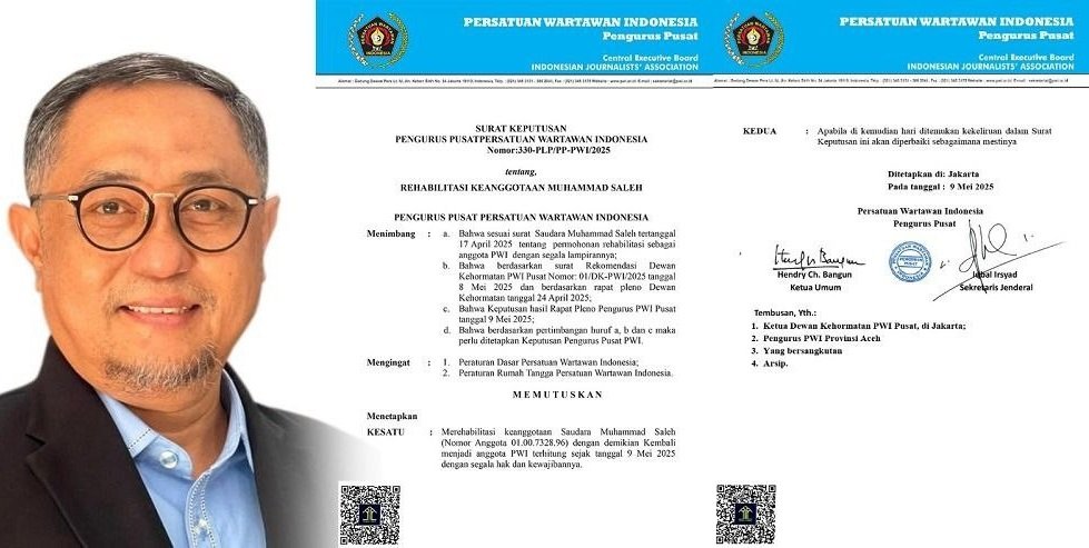BANDA ACEH – Persatuan Wartawan Indonesia (PWI) Pusat memulihkan status keanggotaan Muhammad Saleh. Ini berdasarkan Surat Keputusan PWI Pusat Nomor: 330-PLP/PP-PWI/2025, ditandatangani Hendry CH dan Iqbal Irsyad Bangun sebagai Ketua Umum dan Sekretaris Jenderal PWI Pusat.