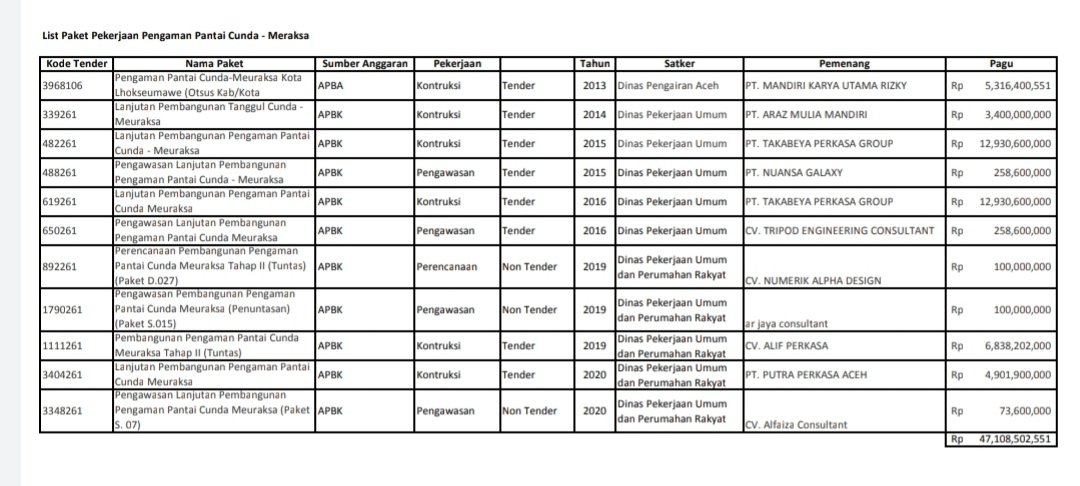 Sementara itu, update data hasil penelusuran MaTA pada situs LPSE Provinsi Aceh dan LPSE Lhokseumawe, Senin, 25 Januari 2021, total dana sudah dialokasikan pemerintah untuk pembangunan pengaman pantai Cunda-Meuraksa sejak tahun 2013 sampai 2020 mencapai Rp47.108.502.551 (Rp47,1 miliar lebih). Dari jumlah itu terbagi dalam enam paket konstruksi, empat paket pengawasan, dan satu paket perencanaan.