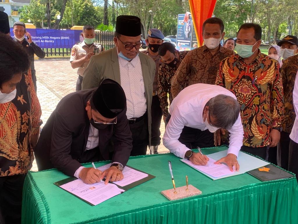BANDA ACEH – Rektor Universitas Islam Negeri (UIN) Ar Raniry dan Rektor Universitas Syiah Kuala (USK), Rabu, 1 Desember 2021 menandatangani Kesepakatan Pengalihan Status Penggunaan Barang Milik Negara (BMN) antara kedua kampus di Lapangan Tugu Komplek Pelajar dan Mahasiswa (Kopelma) Darussalam.