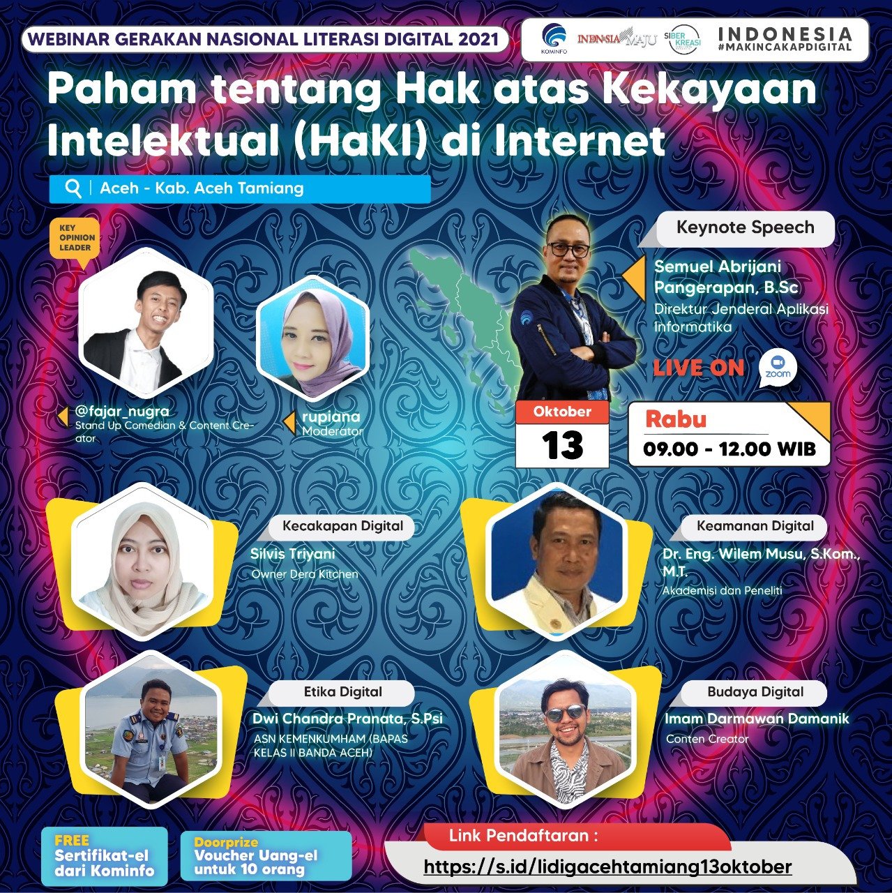 KARANGBARU – Rangkaian Webinar Literasi Digital di Kabupaten Aceh Tamiang, Provinsi Aceh kembali bergulir. Pada Rabu, 13 Oktober 2021 pukul 09.00 hingga 12.00 WIB, telah dilangsungkan webinar bertajuk “Paham Tentang Hak Atas Kekayaan Intelektual (Haki) di Internet”.