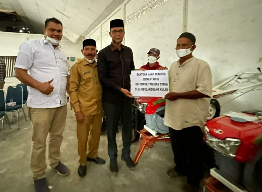 BIREUEN – Anggota Komisi IV DPR RI, TA. Khalid, menyerahkan Alsintan kepada sejumlah Kelompok Tani di Kabupaten Bireuen yang diterima masing-masing ketua kelompok, disaksikan Kadis Pertanian dan Perkebunan Irwan, S.P., M.Si., Senin (18/10), di Gudang Distanbun BPP Peudada.