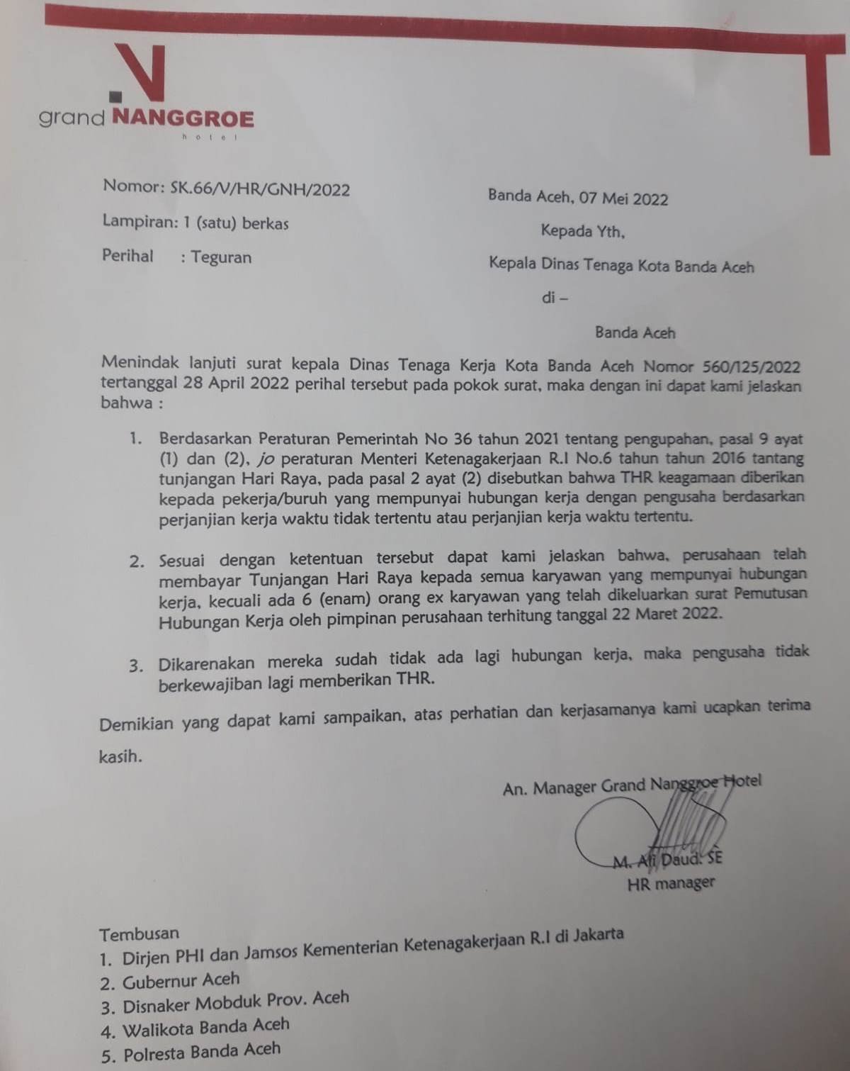 Sedangkan poin 2 ditegaskan, dikarenakan mereka tidak ada lagi hubungan kerja, maka pengusaha tidak berkewajiban lagi membayar THR. Surat yang ditandatangi M. Ali Daud, S.E., ini turut ditembuskan kepada Dirjen PHI dan Jamsos Kementerian Ketenagakerjaan R.I., Gubernur Aceh, Disnakermobduk Aceh, Wali Kota Banda Aceh, dan Polresta Banda Aceh.