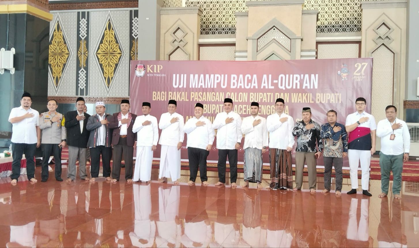 KUTACANE – Tiga bakal pasangan calon bupati dan wakil bupati Aceh Tenggara mengikuti uji mampu baca Alquran di Masjid Agung At Taqwa Kutacane, Kamis, 5 September 2024.