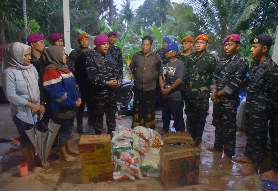 LHOKSUKON – Pangkalan TNI Angkatan Laut (Lanal) Lhokseumawe bersama Kipan B Yonko 469 Kopasgat menyalurkan bantuan untuk korban banjir di Kabupaten Aceh Utara, Kamis, 6 Oktober 2022. Bantuan diantarkan ke lokasi pengungsian korban banjir di desa yang masih terisolir.