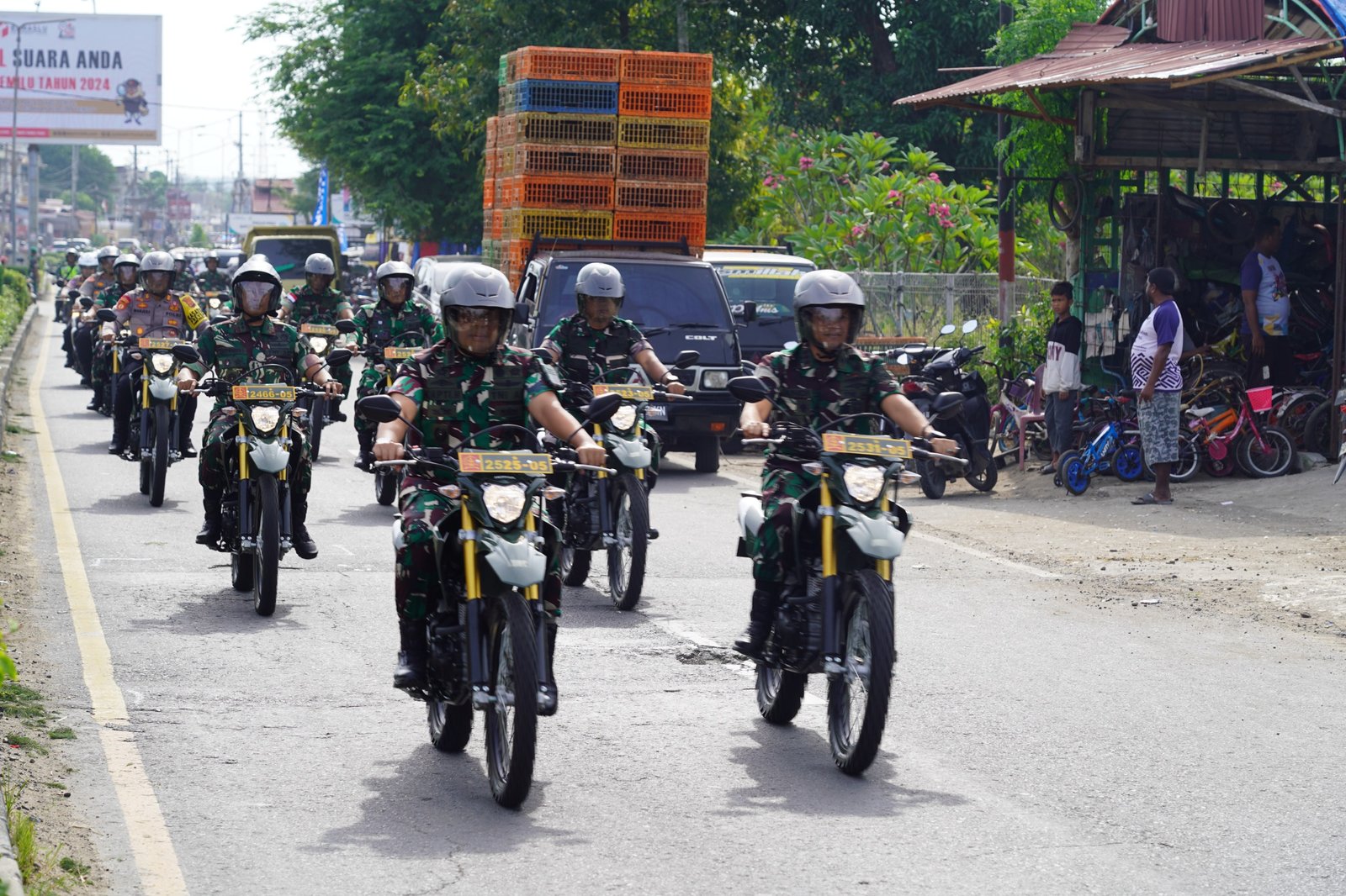 LHOKSEUMAWE – Ratusan personel TNI-Polri dan Forkopimda patroli bersama menggunakan motor trail dinas keliling di wilayah Kota Lhokseumawe dan Kabupaten Aceh Utara, Sabtu, 17 Februari 2024.
