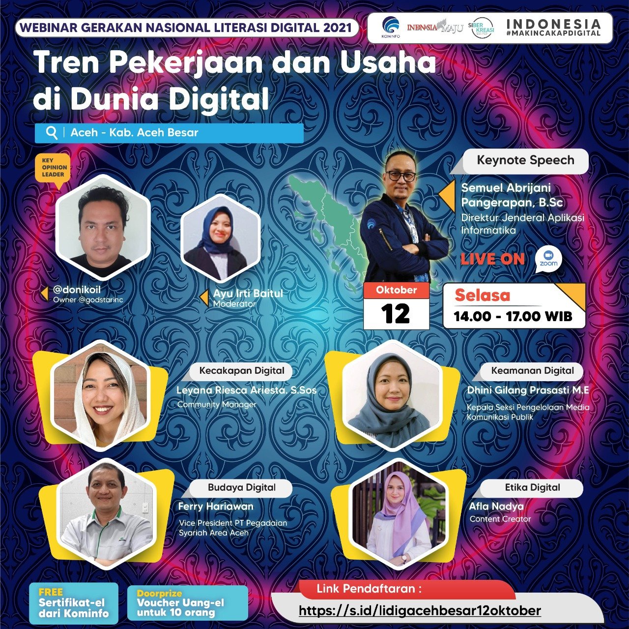JANTHO – Rangkaian Webinar Literasi Digital di Kabupaten Aceh Besar, Provinsi Aceh Kembali bergulir. Pada Selasa, 12 Oktober 2021 pukul 14.00 hingga 17.00 WIB, telah dilangsungkan webinar bertajuk “Tren Pekerjaan dan Usaha di Dunia Digital”.