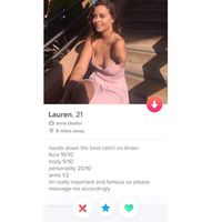 Lauren menjadi viral setelah memposting profil dirinya di Tinder ke akun Twitter-nya. Dalam profilnya, Lauren menulis: “hands down the best catch on tinder; face 10/10; body 9/10; personality 20/10; arms 1/2.”