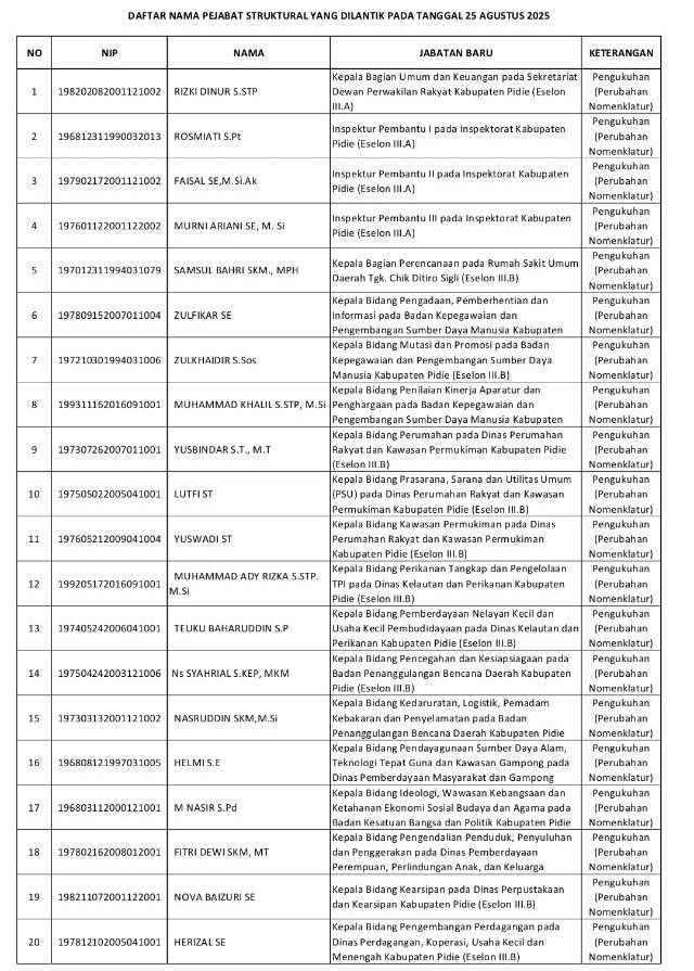 SIGLI – Sebanyak 45 pejabat struktural eselon III dan IV di lingkungan Pemerintah Kabupaten Pidie, dilantik oleh Wakil Bupati Pidie, Alzaizi, di Op-Room Setretariat Daerah, Senin, 25 Agustus 2025.